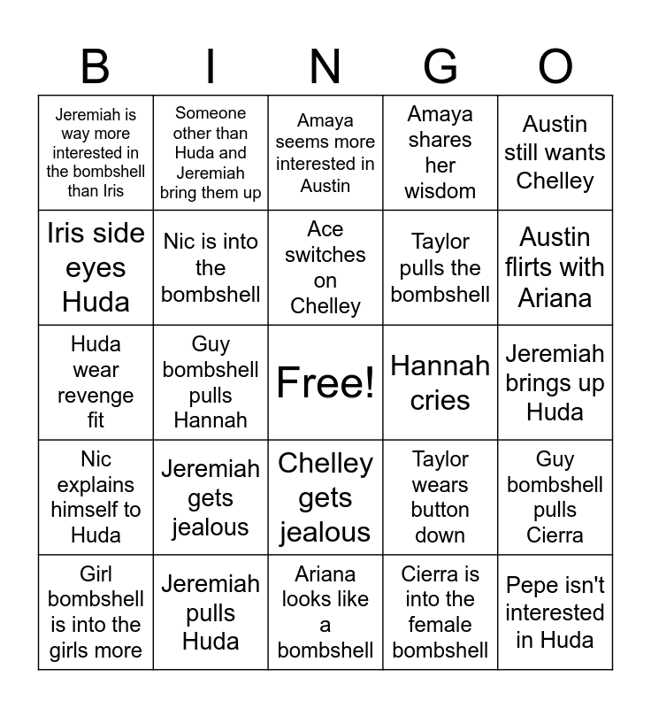 This bingo card has a free space and 24 words: Jeremiah gets jealous, Jeremiah pulls Huda, Ace switches on Chelley, Girl bombshell is into the girls more, Austin still wants Chelley, Jeremiah is way more interested in the bombshell than Iris, Iris side eyes Huda, Someone other than Huda and Jeremiah bring them up, Hannah cries, Chelley gets jealous, Taylor pulls the bombshell, Huda wear revenge fit, Taylor wears button down, Guy bombshell pulls Cierra, Nic is into the bombshell, Cierra is into the female bombshell, Jeremiah brings up Huda, Amaya seems more interested in Austin, Austin flirts with Ariana, Guy bombshell pulls Hannah, Pepe isn't interested in Huda, Nic explains himself to Huda, Amaya shares her wisdom and Ariana looks like a bombshell.