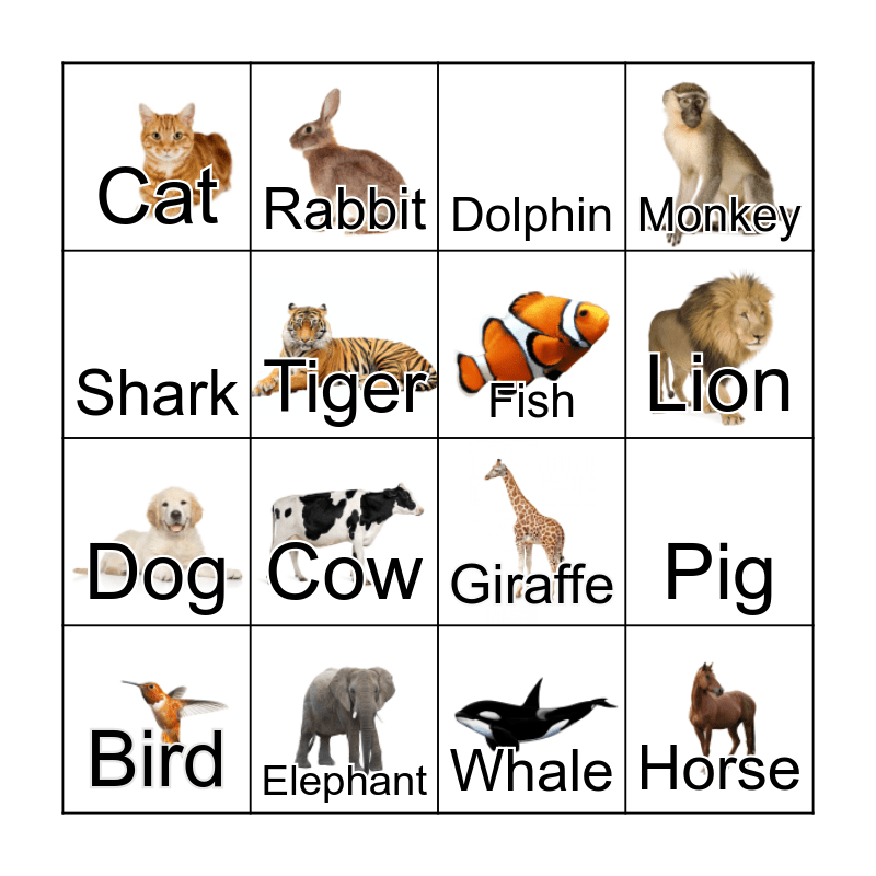 This bingo card has 13 images and 16 words: Elephant, Pig, Dolphin, Cat, Dog, Rabbit, Giraffe, Whale, Shark, Tiger, Bird, Monkey, Cow, Lion, Fish and Horse.