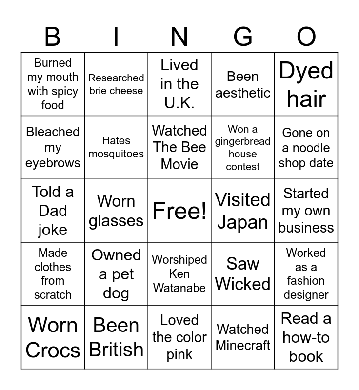 This bingo card has a free space and 24 words: Owned a pet dog, Been British, Watched The Bee Movie, Worn Crocs, Dyed hair, Burned my mouth with spicy food, Bleached my eyebrows, Researched brie cheese, Visited Japan, Worshiped Ken Watanabe, Won a gingerbread house contest, Told a Dad joke, Saw Wicked, Worked as a fashion designer, Hates mosquitoes, Watched Minecraft, Started my own business, Lived in the U.K., Gone on a noodle shop date, Worn glasses, Read a how-to book, Made clothes from scratch, Been aesthetic and Loved the color pink.