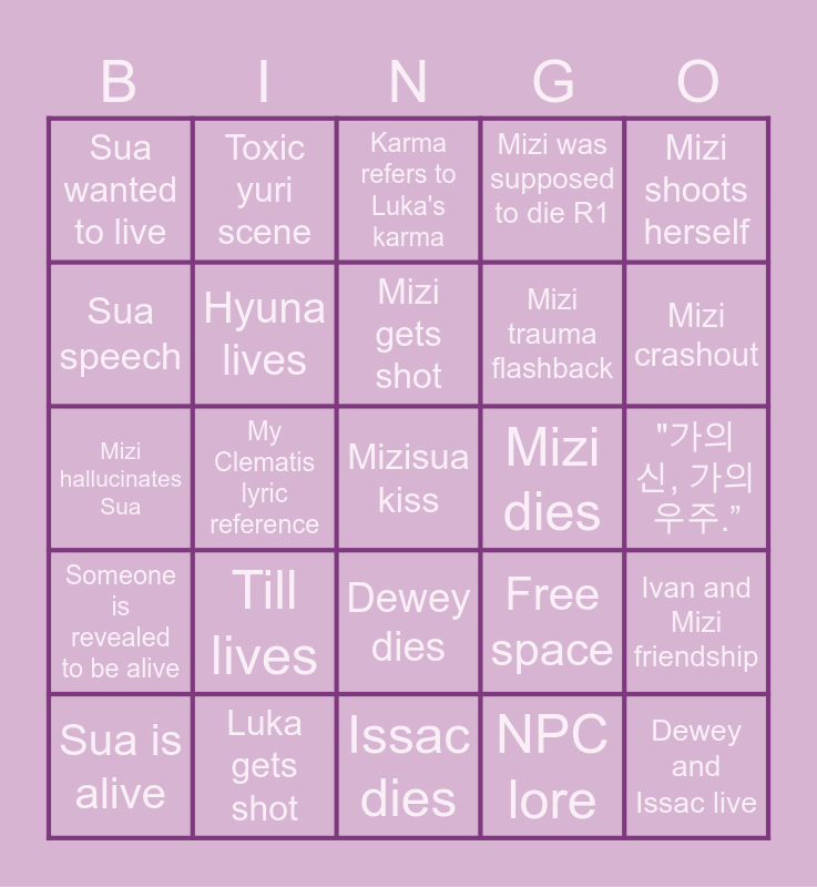 This bingo card has 25 words: Till lives, Issac dies, Mizi gets shot, Sua is alive, Mizi shoots herself, Sua wanted to live, Sua speech, Toxic yuri scene, Mizi dies, Dewey dies, Mizi trauma flashback, Mizi hallucinates Sua, Free space, Ivan and Mizi friendship, Hyuna lives, Dewey and Issac live, "가의 신, 가의 우주.”, Karma refers to Luka's karma, Mizi crashout, My Clematis lyric reference, Mizisua kiss, Luka gets shot, Someone is revealed to be alive, Mizi was supposed to die R1 and NPC lore.