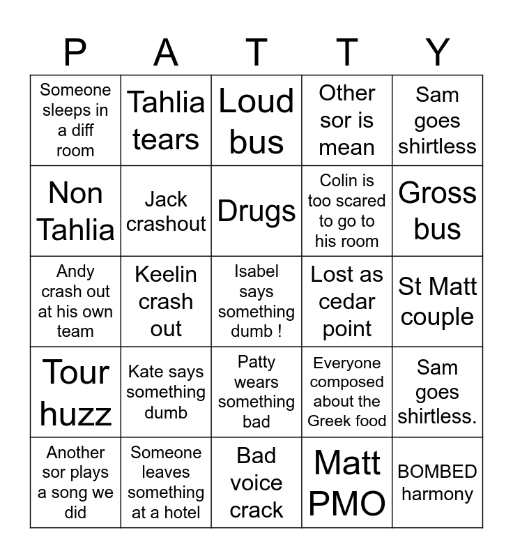 This bingo card has a free space and 24 words: Kate says something dumb, Someone leaves something at a hotel, Drugs, Another sor plays a song we did, Sam goes shirtless, Someone sleeps in a diff room, Non Tahlia, Tahlia tears, Lost as cedar point, Patty wears something bad, Colin is too scared to go to his room, Andy crash out at his own team, Everyone composed about the Greek food, Sam goes shirtless., Jack crashout, Matt PMO, St Matt couple, Loud bus, Gross bus, Keelin crash out, BOMBED harmony, Tour huzz, Other sor is mean and Bad voice crack.