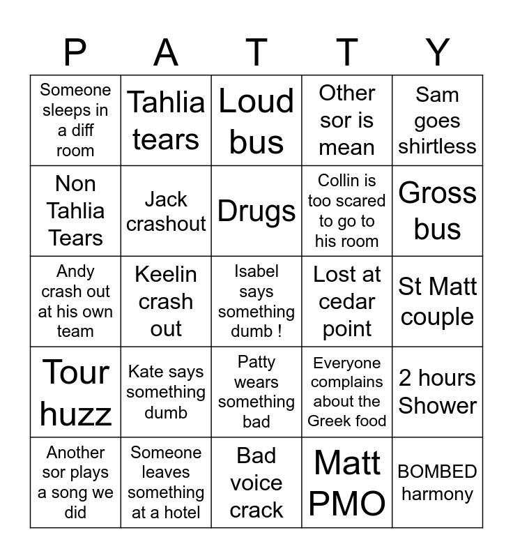 This bingo card has a free space and 24 words: Kate says something dumb, Someone leaves something at a hotel, Drugs, Another sor plays a song we did, Sam goes shirtless, Someone sleeps in a diff room, Non Tahlia Tears, Tahlia tears, Lost at cedar point, Patty wears something bad, Collin is too scared to go to his room, Andy crash out at his own team, Everyone complains about the Greek food, 2 hours Shower, Jack crashout, Matt PMO, St Matt couple, Loud bus, Gross bus, Keelin crash out, BOMBED harmony, Tour huzz, Other sor is mean and Bad voice crack.