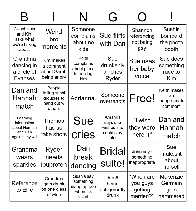 This bingo card has 36 words: Bridal suite!, Dan break dancing, Dan A. being belligerently drunk, Grandma dancing in a circle of Evanses, Learning information about Hannah and Dan against my will, Someone overreacts, Kim makes a comment about Sarah being angry, Sushis say something inappropriate when it’s silent, Shannon referencing not being gay, John says something inappropriate, Sue does something rude to Kim, Sue flirts with Dan, Sue makes it about herself, People telling sushi groupies to hang out w others, Sue drunkenly pinches Ryder, We whisper and Kim asks what we’re talking about, Grandma wears sparkles, Free!, Dan and Hannah match, Someone complains about no kids, Adrianna., Thomas has us take shots, Amanda says she wishes she could stay later, Sue cries, “I wish they were here :(“, Weird bro moments, Sue uses her baby voice, Grandma gets drunk off one glass of wine, Keith complains about plans impacting him, Sushis bombard the photo booth, Makenzie Germain gets hammered, Reference to Ellie, Dan and Hannah match, Keith makes an inappropriate comment, Ryder needs ibuprofen and “When are you guys getting married?”.