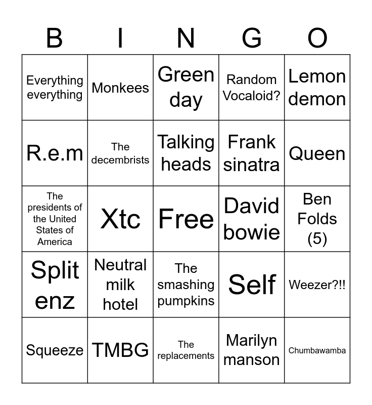 This bingo card has a free space and 24 words: Neutral milk hotel, TMBG, Talking heads, Squeeze, Lemon demon, Everything everything, R.e.m, Monkees, David bowie, The smashing pumpkins, Frank sinatra, The presidents of the United States of America, Self, Weezer?!!, The decembrists, Marilyn manson, Ben Folds (5), Green day, Queen, Xtc, Chumbawamba, Split enz, Random Vocaloid? and The replacements.