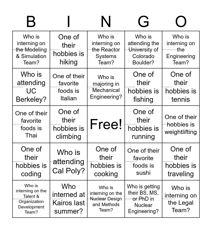 This bingo card has 24 images, a free space and 24 words: Who is attending Cal Poly?, Who interned at Kairos last summer?, Who is majoring in Mechanical Engineering?, Who is interning on the Talent & Organization Development Team?, Who is interning on the Engineering Team?, Who is interning on the Modeling & Simulation Team?, Who is attending UC Berkeley?, One of their hobbies is hiking, One of their hobbies is running, One of their hobbies is cooking, One of their hobbies is fishing, One of their favorite foods is Thai, One of their favorite foods is sushi, One of their hobbies is traveling, One of their favorite foods is Italian, Who is getting their BS, MS, or PhD in Nuclear Engineering?, One of their hobbies is weightlifting, Who is interning on the Reactor Systems Team?, One of their hobbies is tennis, One of their hobbies is climbing, Who is interning on the Legal Team?, One of their hobbies is coding, Who is attending the University of Colorado Boulder? and Who is interning on the Nuclear Design and Methods Team?.