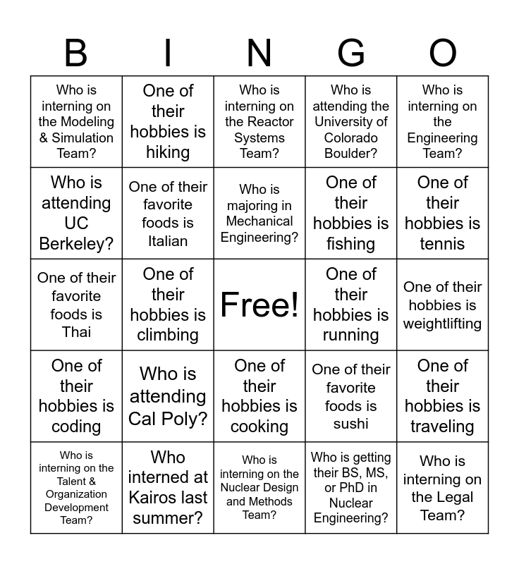 This bingo card has a free space and 24 words: Who is attending Cal Poly?, Who interned at Kairos last summer?, Who is majoring in Mechanical Engineering?, Who is interning on the Talent & Organization Development Team?, Who is interning on the Engineering Team?, Who is interning on the Modeling & Simulation Team?, Who is attending UC Berkeley?, One of their hobbies is hiking, One of their hobbies is running, One of their hobbies is cooking, One of their hobbies is fishing, One of their favorite foods is Thai, One of their favorite foods is sushi, One of their hobbies is traveling, One of their favorite foods is Italian, Who is getting their BS, MS, or PhD in Nuclear Engineering?, One of their hobbies is weightlifting, Who is interning on the Reactor Systems Team?, One of their hobbies is tennis, One of their hobbies is climbing, Who is interning on the Legal Team?, One of their hobbies is coding, Who is attending the University of Colorado Boulder? and Who is interning on the Nuclear Design and Methods Team?.