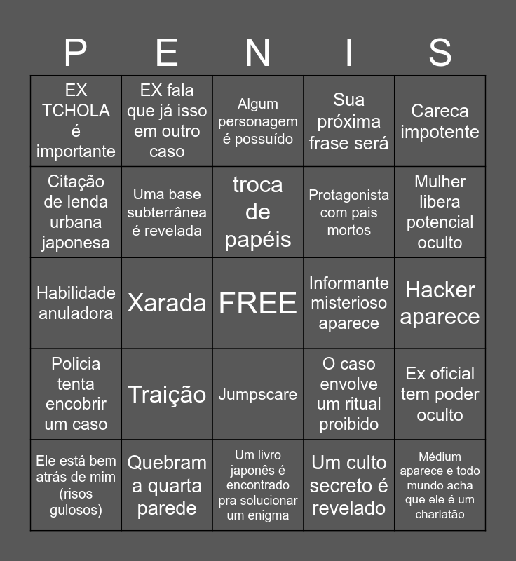 This bingo card has a free space and 24 words: Traição, Quebram a quarta parede, troca de papéis, Ele está bem atrás de mim (risos gulosos), Careca impotente, EX TCHOLA é importante, Citação de lenda urbana japonesa, EX fala que já isso em outro caso, Informante misterioso aparece, Jumpscare, Protagonista com pais mortos, Habilidade anuladora, O caso envolve um ritual proibido, Ex oficial tem poder oculto, Uma base subterrânea é revelada, Um culto secreto é revelado, Hacker aparece, Algum personagem é possuído, Mulher libera potencial oculto, Xarada, Médium aparece e todo mundo acha que ele é um charlatão, Policia tenta encobrir um caso, Sua próxima frase será and Um livro japonês é encontrado pra solucionar um enigma.