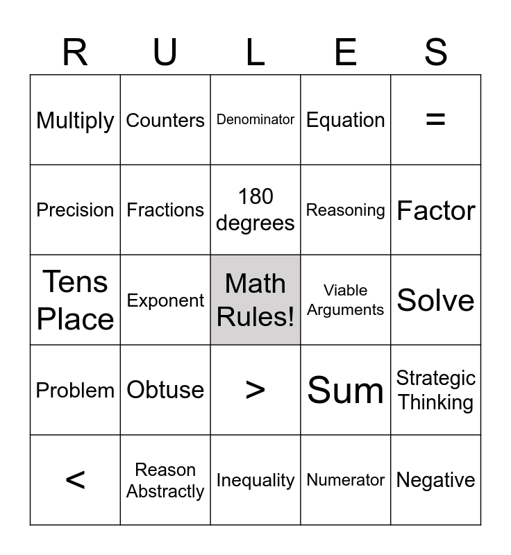 This bingo card has 1 images, a free space and 53 words: Divide, Problem, Integer, Persevere, >, Add, Equation, Positive, Precision, X, Multiply, Function, Reason Abstractly, <, Evaluate, Inequality, Negative, Reasoning, +, Solve, Sum, Place Value, Viable Arguments, =, Subtract, Counters, Hundreds Place, Models, -, Numerator, Number Line, Ones Place, Math Structure, $, Denominator, 10 Frames, Tens Place, Strategic Thinking, %, Fractions, Spinners, Google, Math Tools, y, Obtuse, Parallel, Isoceles, Protractor, 180 degrees, Exponent, Factor, Expanded Form and Notation.
