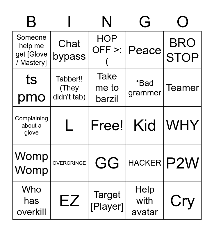 This bingo card has a free space and 24 words: OVERCRINGE, EZ, Take me to barzil, Who has overkill, BRO STOP, Someone help me get [Glove / Mastery], ts pmo, Chat bypass, Kid, GG, *Bad grammer, Complaining about a glove, HACKER, P2W, Tabber!! (They didn't tab), Help with avatar, WHY, HOP OFF >:(, Teamer, L, Cry, Womp Womp, Peace and Target [Player].