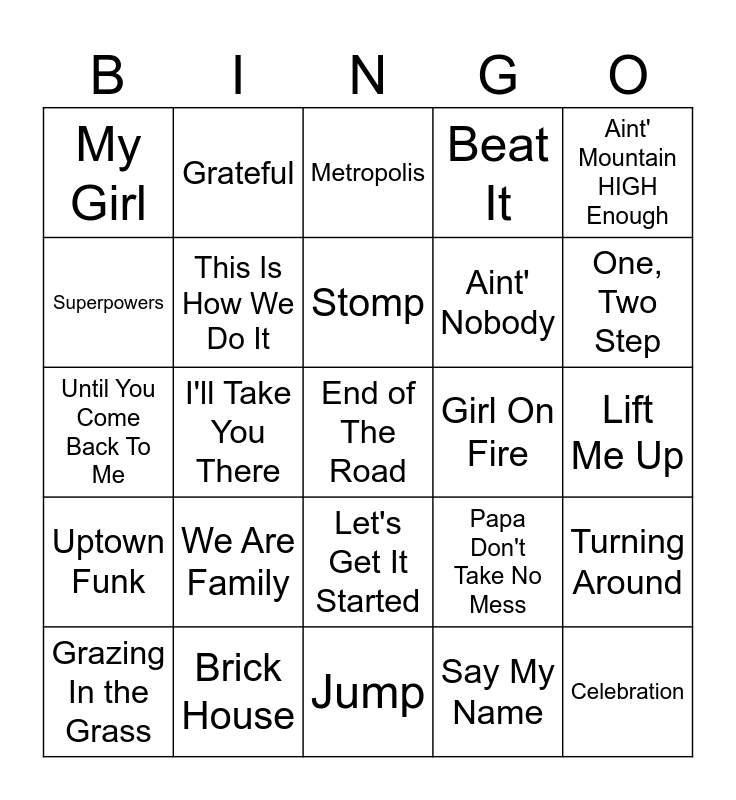 This bingo card has a free space and 29 words: Grazing In the Grass, Ain't No Woman, I'll Take You There, Never Too Much, My Girl, Metropolis, This Is How We Do It, We Are Family, Girl On Fire, Brick House, Lift Me Up, Celebration, Jump, Say My Name, One, Two Step, Single Ladies, Let's Get It Started, Uptown Funk, Aint' Mountain HIGH Enough, Until You Come Back To Me, Papa Don't Take No Mess, I Got That Feeling, Aint' Nobody, Superpowers, Beat It, Grateful, Turning Around, Stomp and Overcomer.