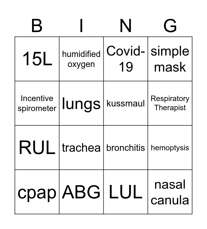 This bingo card has 54 words: Free!, nasal canula, venturi mask, hypoxia, hyperventilation, hypoventilation, simple mask, non-rebreather, lungs, 5L, 15L, carbon dioxide, oxygen, Medical air, lungs, bipap, cpap, RUL, RLL, LUL, LLL, christmas tree, ABG, Incentive spirometer, COPD, humidified oxygen, hypercapnia, hypoxemia, ambu bag, pneumonia, Pulmonary Embolus, perfusion, nebulizer, RSV, Covid-19, asthma, bronchitis, respiratory rate, cheyne-stokes, kussmaul, bronchus, tracheostomy, inhalation, exhalation, pulmonary, tachypnea, atelectasis, pulmonologist, Respiratory Therapist, hemoptysis, trachea, apnea, 12-20/min and inhaler.