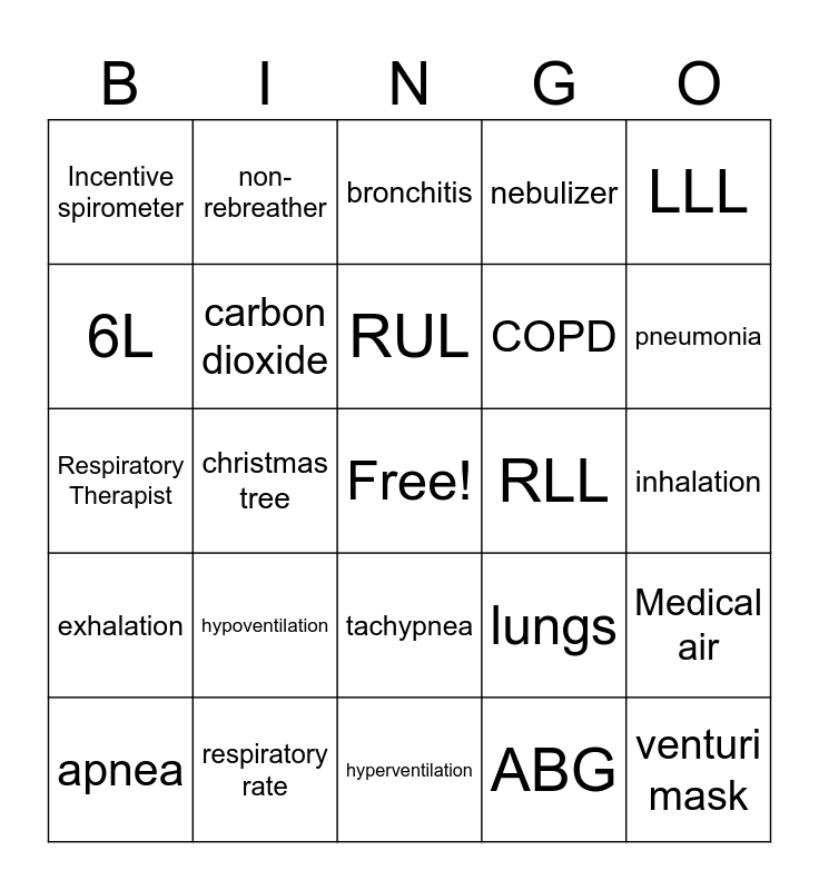 This bingo card has a free space and 52 words: nasal canula, venturi mask, hypoxia, hyperventilation, hypoventilation, simple mask, non-rebreather, lungs, 6L, 15L, carbon dioxide, oxygen, Medical air, lungs, bipap, cpap, RUL, RLL, LUL, LLL, christmas tree, ABG, Incentive spirometer, COPD, humidified oxygen, hypercapnia, hypoxemia, ambu bag, pneumonia, Pulmonary Embolus, perfusion, nebulizer, RSV, Covid-19, asthma, bronchitis, respiratory rate, cheyne-stokes, kussmaul, bronchus, tracheostomy, inhalation, exhalation, pulmonary, tachypnea, atelectasis, pulmonologist, Respiratory Therapist, hemoptysis, trachea, apnea and 12-20/min.