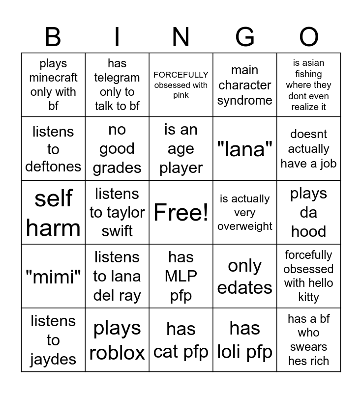 This bingo card has a free space and 24 words: listens to lana del ray, plays roblox, is an age player, listens to jaydes, is asian fishing where they dont even realize it, plays minecraft only with bf, listens to deftones, has telegram only to talk to bf, is actually very overweight, has MLP pfp, "lana", self harm, only edates, forcefully obsessed with hello kitty, no good grades, has loli pfp, plays da hood, FORCEFULLY obsessed with pink, doesnt actually have a job, listens to taylor swift, has a bf who swears hes rich, "mimi", main character syndrome and has cat pfp.