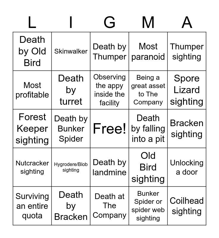 This bingo card has a free space and 30 words: Death by Bracken, Death by Coilhead, Death by Bunker Spider, Death by Eyeless Dog, Death by Old Bird, Death by Thumper, Death by turret, Death by landmine, Death by falling into a pit, Death at The Company, Bracken sighting, Coilhead sighting, Bunker Spider or spider web sighting, Yippee Bug sighting, Spore Lizard sighting, Ghost Girl sighting, Old Bird sighting, Nutcracker sighting, Hygrodere/Blob sighting, Thumper sighting, Forest Keeper sighting, Masked sighting, Skinwalker, Being a great asset to The Company, Most profitable, Most paranoid, Unlocking a door, Surviving an entire quota, Observing the appy inside the facility and Surviving a round with no flashlight (min. ~5 min. In the facility).