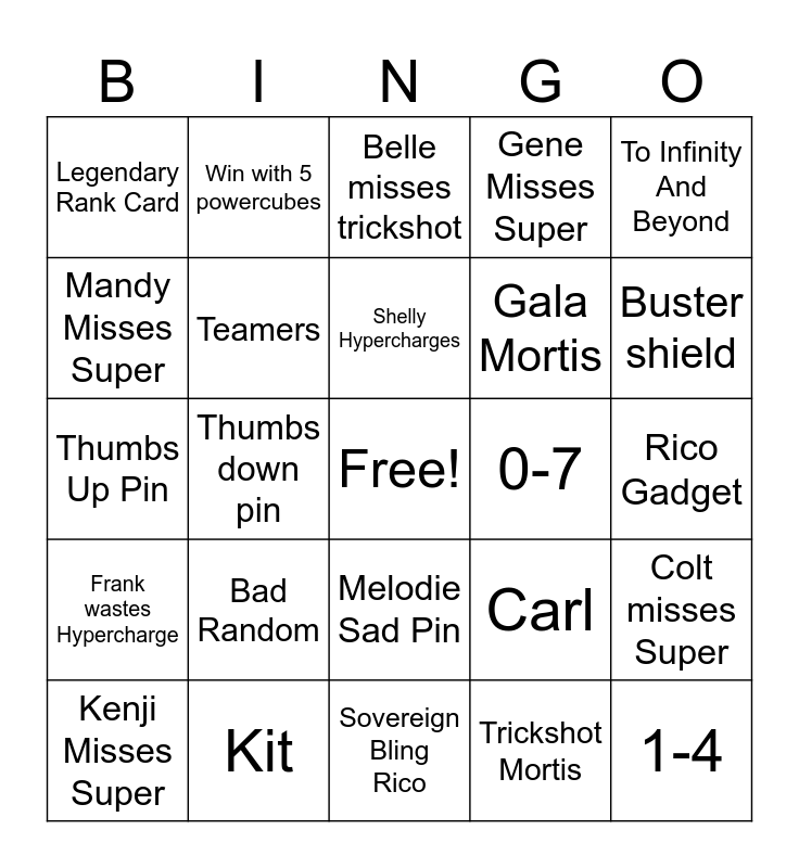 This bingo card has a free space and 24 words: Bad Random, Kit, Shelly Hypercharges, Kenji Misses Super, To Infinity And Beyond, Legendary Rank Card, Mandy Misses Super, Win with 5 powercubes, 0-7, Melodie Sad Pin, Gala Mortis, Thumbs Up Pin, Carl, Colt misses Super, Teamers, Trickshot Mortis, Rico Gadget, Belle misses trickshot, Buster shield, Thumbs down pin, 1-4, Frank wastes Hypercharge, Gene Misses Super and Sovereign Bling Rico.