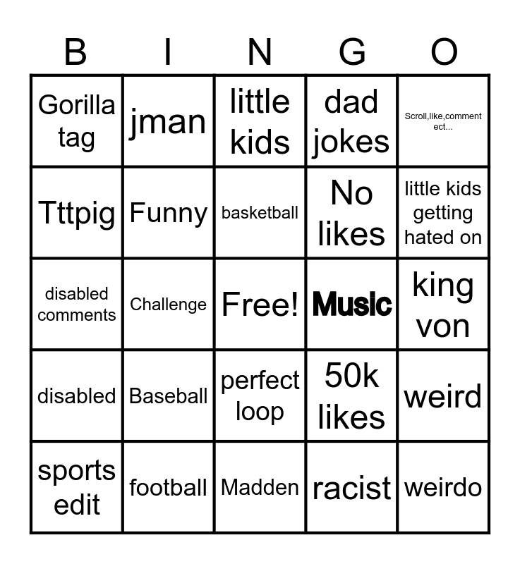 This bingo card has a free space and 24 words: Baseball, football, basketball, sports edit, Scroll,like,comment ect..., Gorilla tag, Tttpig, jman, Music, perfect loop, No likes, disabled comments, 50k likes, weird, Funny, racist, king von, little kids, little kids getting hated on, Challenge, weirdo, disabled, dad jokes and Madden.