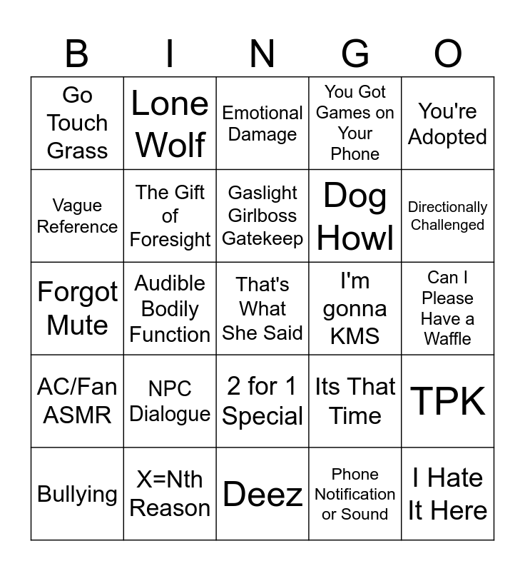This bingo card has 64 words: Game Crash, Sibling Spat, Crash out, TPK, Solo Win, Controller Issues, Lone Wolf, Old Vine Reference, Gaslight Girlboss Gatekeep, JoJo Warcry, 2 for 1 Special, Stupid Spawn, Can I Please Have a Waffle, You're Adopted, What's This guy's Name, Vague Reference, Audible Bodily Function, Go Touch Grass, IRL Lore, Dog Howl, NPC Dialogue, AC/Fan ASMR, You Got Games on Your Phone, Severe Friendly Fire Incident, Bad Puns, Eating on Mic, Door Hinge, I'm Gonna Cry, Star Wars Rant, Can't Speak, I'm Gonna Tell Mom, Sleep Check, Spanish, Ice Cream Mention, Directionally Challenged, Bullying, Random Singing, Phone Notification or Sound, Instant Karma, The Gift of Foresight, Forgot Mute, I'm gonna KMS, Conspiracy Theory Talk, Nerd Moment, Old Slang, That's What She Said, X=Nth Reason, I Hate It Here, Its That Time, Skill Issue, Rage Bait, This When..., Deez, Whale Sounds, Would, Soundboard, Emotional Damage, Impersonation, Mispronunciation, Cruel and Unusual Punishment, Vocal Stimming, Hey Siri, Muffin Man and Greed.