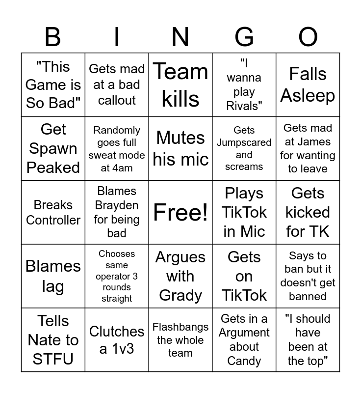 This bingo card has a free space and 24 words: Chooses same operator 3 rounds straight, Clutches a 1v3, Mutes his mic, Tells Nate to STFU, Falls Asleep, "This Game is So Bad", Get Spawn Peaked, Gets mad at a bad callout, Plays TikTok in Mic, Argues with Grady, Gets Jumpscared and screams, Breaks Controller, Gets on TikTok, Says to ban but it doesn't get banned, Randomly goes full sweat mode at 4am, Gets in a Argument about Candy, Gets kicked for TK, Team kills, Gets mad at James for wanting to leave, Blames Brayden for being bad, "I should have been at the top", Blames lag, "I wanna play Rivals" and Flashbangs the whole team.