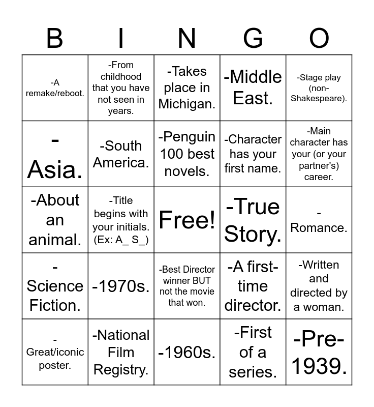 This bingo card has a free space and 51 words: -Birth Year., -Pre-1939., -This calendar year., -1960s., -1970s., -1950s., -From childhood that you have not seen in years., -1999., -Asia., -Africa., -South America., -Middle East., -Written and directed by a woman., -A first-time director., -LGBTQ main character or writer/director., -POC director., -Penguin 100 best novels., -True Story., -Shakespeare., -Stage play (non-Shakespeare)., -Title begins with your initials. (Ex: A_ S_), -First of a series., -A remake/reboot., -Character has your first name., -Longer than 3 hours., -Color in the title., -Main character has your (or your partner's) career., -Number in the title (not related to sequel status)., -Great/iconic poster., -Takes place in Michigan., -Sound and Sights (Top 25), -Oscar Best Picture winner., -Oscar Best Picture nominee/loser., -Razzie Worst Picture nominee., -Oscar Nominated Live Action Short., -National Film Registry., -Western., -Crime/Mystery., -Silent Film., -Musical., -Romance., -Science Fiction., -Documentary., -Non-Winter Holiday., -Childrens., -Action/Adventure., -About an animal., -Alfred Hitchcock., -Stanley Kubrick., -Best Director winner BUT not the movie that won. and -Wes Anderson..