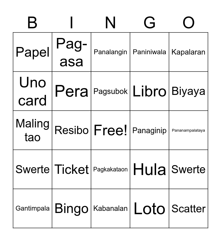 This bingo card has a free space and 24 words: Ticket, Bingo, Pagsubok, Gantimpala, Kapalaran, Papel, Uno card, Pag-asa, Panaginip, Pagkakataon, Libro, Maling tao, Hula, Swerte, Pera, Loto, Pananampalataya, Panalangin, Biyaya, Resibo, Scatter, Swerte, Paniniwala and Kabanalan.