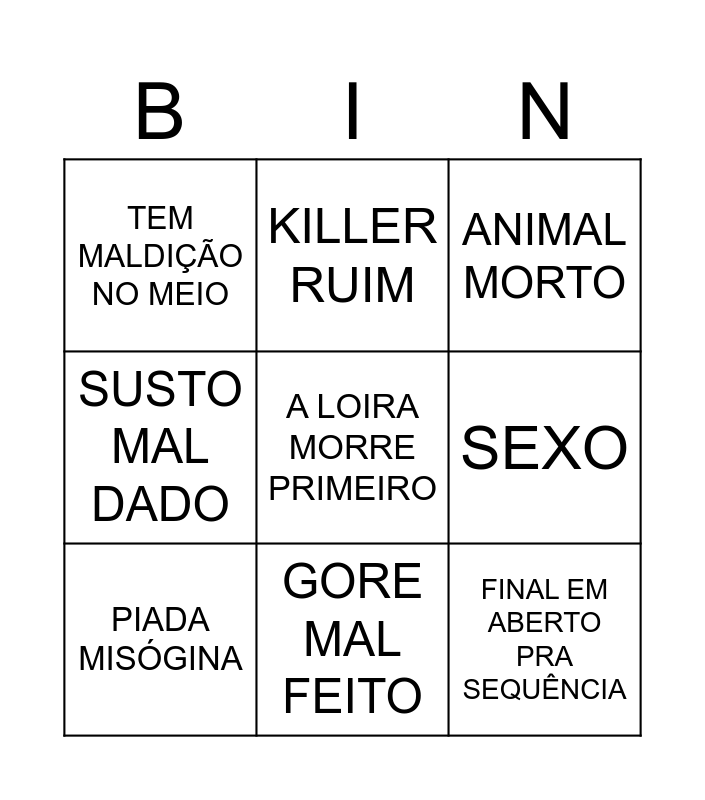 This bingo card has a free space and 8 words: SEXO, ANIMAL MORTO, KILLER RUIM, PIADA MISÓGINA, TEM MALDIÇÃO NO MEIO, FINAL EM ABERTO PRA SEQUÊNCIA, SUSTO MAL DADO and GORE MAL FEITO.