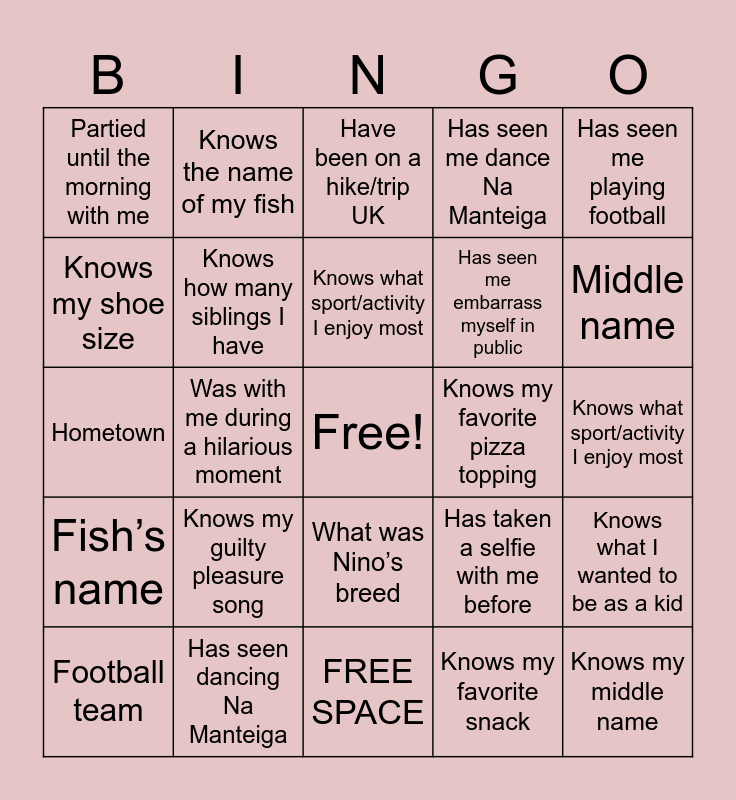 This bingo card has a free space and 49 words: Has been to a festival with me, Knows my middle name, Knows my football team, FREE SPACE, Knows my guilty pleasure song, Knows Nino’s breed, Knows the name of my fish, Knows my birthday date, Knows my shoe size, Knows my celebrity crush, Knows how many siblings I have, Has seen me dance Na Manteiga, Knows what I wanted to be as a kid, Has taken a selfie with me before, Knows the name of my pet (or that I don’t have one), Knows my parents' names, Knows what sport/activity I enjoy most, Knows my favorite pizza topping, Has borrowed something from me, Has seen me playing football, Was with me during a hilarious moment, Knows my favorite snack, Partied until the morning with me, Has seen me embarrass myself in public, To a festival with me, Middle name, Football team, FREE SPACE, What was Nino’s breed, Fish’s name, D.O.B., Shoe size, Celebrity crush, How many siblings, Has seen dancing Na Manteiga, What I wanted to be as a kid, Travelled abroad together, Parents' names, Knows what sport/activity I enjoy most, Football tournment in 2019, Has borrowed something from me, Has seen playing football, Party until the morning, One of my top 3 dishes, Hometown, Have been on a hike/trip UK, Has been to a festival with me, Has been to a festival with me and Has been to a festival with me.