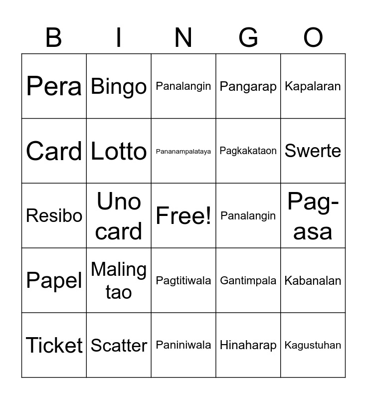 This bingo card has a free space and 24 words: Ticket, Maling tao, Pananampalataya, Hinaharap, Kapalaran, Pera, Bingo, Panalangin, Panalangin, Pag-asa, Resibo, Lotto, Gantimpala, Kabanalan, Card, Scatter, Paniniwala, Pangarap, Swerte, Papel, Uno card, Pagtitiwala, Pagkakataon and Kagustuhan.