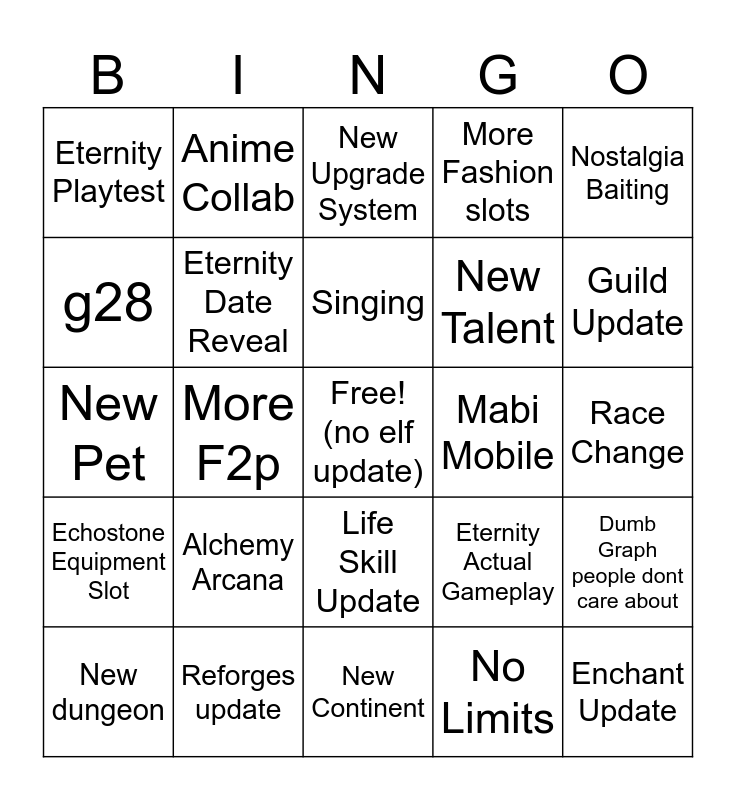 This bingo card has a free space and 24 words: Alchemy Arcana, Reforges update, Singing, New dungeon, Nostalgia Baiting, Eternity Playtest, g28, Anime Collab, Mabi Mobile, Life Skill Update, New Talent, New Pet, Eternity Actual Gameplay, Dumb Graph people dont care about, Eternity Date Reveal, No Limits, Race Change, New Upgrade System, Guild Update, More F2p, Enchant Update, Echostone Equipment Slot, More Fashion slots and New Continent.