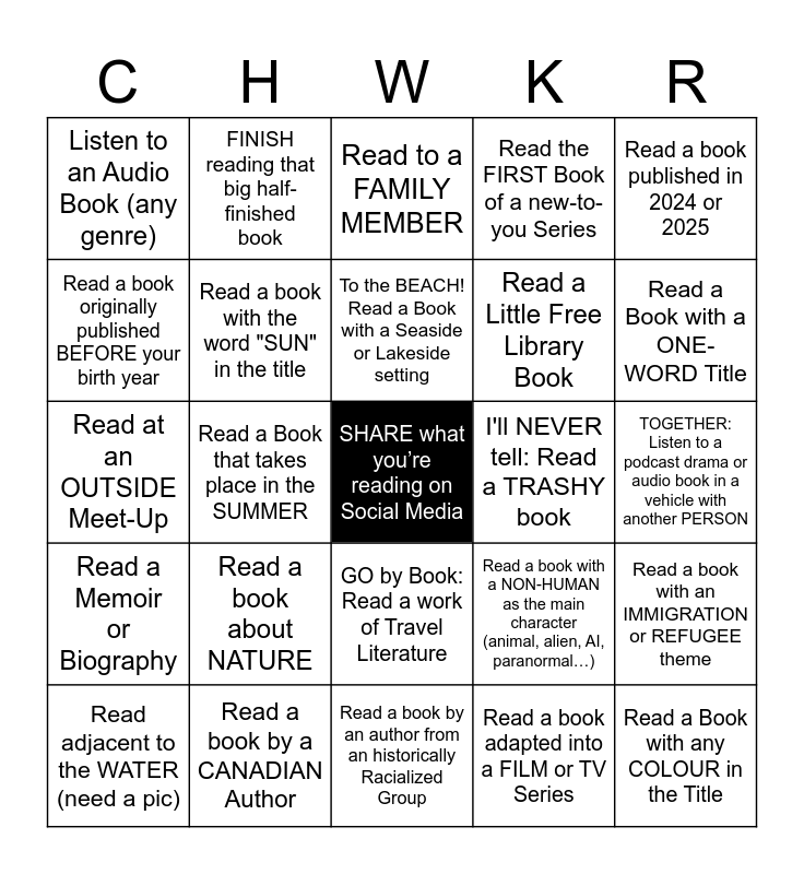 This bingo card has a free space and 24 words: Read a book about NATURE, Read a book by a CANADIAN Author, To the BEACH! Read a Book with a Seaside or Lakeside setting, Read adjacent to the WATER (need a pic), Read a book published in 2024 or 2025, Listen to an Audio Book (any genre), Read a book originally published BEFORE your birth year, FINISH reading that big half-finished book, I'll NEVER tell: Read a TRASHY book, GO by Book: Read a work of Travel Literature, Read a Little Free Library Book, Read at an OUTSIDE Meet-Up, Read a book with a NON-HUMAN as the main character (animal, alien, AI, paranormal…), Read a book with an IMMIGRATION or REFUGEE theme, Read a book with the word "SUN" in the title, Read a book adapted into a FILM or TV Series, TOGETHER: Listen to a podcast drama or audio book in a vehicle with another PERSON, Read to a FAMILY MEMBER, Read a Book with a ONE-WORD Title, Read a Book that takes place in the SUMMER, Read a Book with any COLOUR in the Title, Read a Memoir or Biography, Read the FIRST Book of a new-to-you Series and Read a book by an author from an historically Racialized Group.