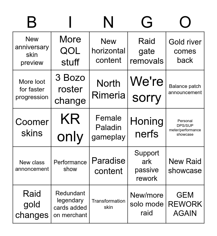 This bingo card has a free space and 24 words: Performance show, Redundant legendary cards added on merchant, North Rimeria, Raid gold changes, Gold river comes back, New anniversary skin preview, More loot for faster progression, More QOL stuff, Honing nerfs, Paradise content, We're sorry, Coomer skins, Support ark passive rework, New Raid showcase, 3 Bozo roster change, New/more solo mode raid, Personal DPS/SUP meter/performance showcase, New horizontal content, Balance patch announcement, KR only, GEM REWORK AGAIN, New class annoncement, Raid gate removals and Transformation skin.