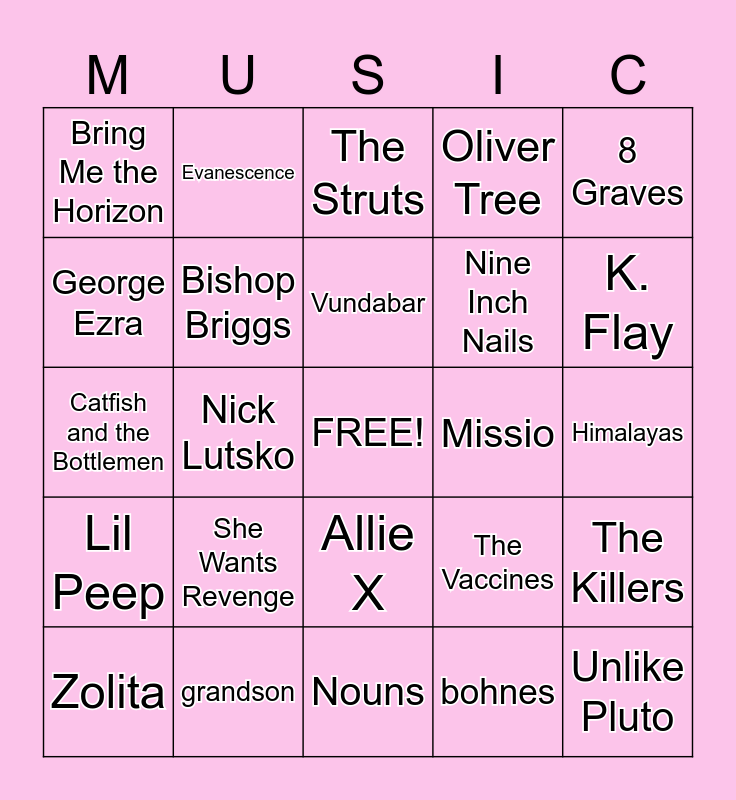 This bingo card has a free space and 24 words: She Wants Revenge, grandson, Vundabar, Zolita, 8 Graves, Bring Me the Horizon, George Ezra, Evanescence, Missio, Allie X, Nine Inch Nails, Catfish and the Bottlemen, The Vaccines, The Killers, Bishop Briggs, bohnes, Himalayas, The Struts, K. Flay, Nick Lutsko, Unlike Pluto, Lil Peep, Oliver Tree and Nouns.