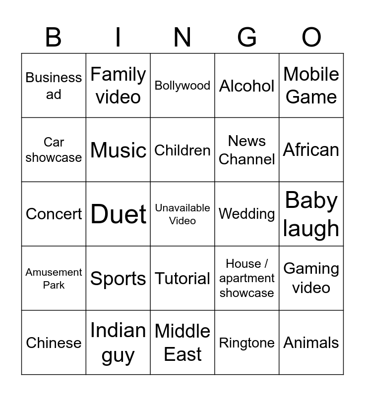 This bingo card has a free space and 24 words: Sports, Indian guy, Children, Chinese, Mobile Game, Business ad, Car showcase, Family video, Wedding, Tutorial, News Channel, Concert, House / apartment showcase, Gaming video, Music, Ringtone, Baby laugh, Bollywood, African, Duet, Animals, Amusement Park, Alcohol and Middle East.