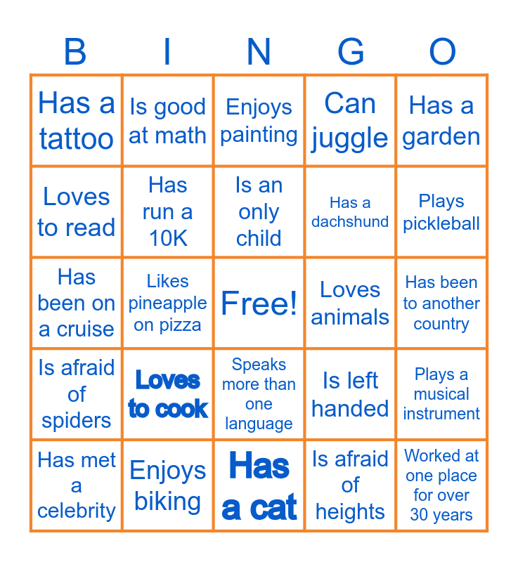 This bingo card has a free space and 24 words: Loves to cook, Enjoys biking, Is an only child, Has met a celebrity, Has a garden, Has a tattoo, Loves to read, Is good at math, Loves animals, Speaks more than one language, Has a dachshund, Has been on a cruise, Is left handed, Plays a musical instrument, Has run a 10K, Is afraid of heights, Has been to another country, Enjoys painting, Plays pickleball, Likes pineapple on pizza, Worked at one place for over 30 years, Is afraid of spiders, Can juggle and Has a cat.