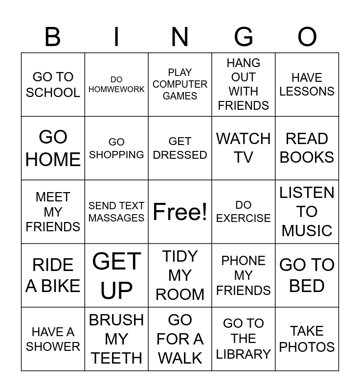 This bingo card has a free space and 24 words: GET UP, BRUSH MY TEETH, GET DRESSED, HAVE A SHOWER, HAVE LESSONS, GO TO SCHOOL, GO HOME, DO HOMWEWORK, DO EXERCISE, TIDY MY ROOM, WATCH TV, MEET MY FRIENDS, PHONE MY FRIENDS, GO TO BED, GO SHOPPING, GO TO THE LIBRARY, LISTEN TO MUSIC, PLAY COMPUTER GAMES, READ BOOKS, SEND TEXT MASSAGES, TAKE PHOTOS, RIDE A BIKE, HANG OUT WITH FRIENDS and GO FOR A WALK.