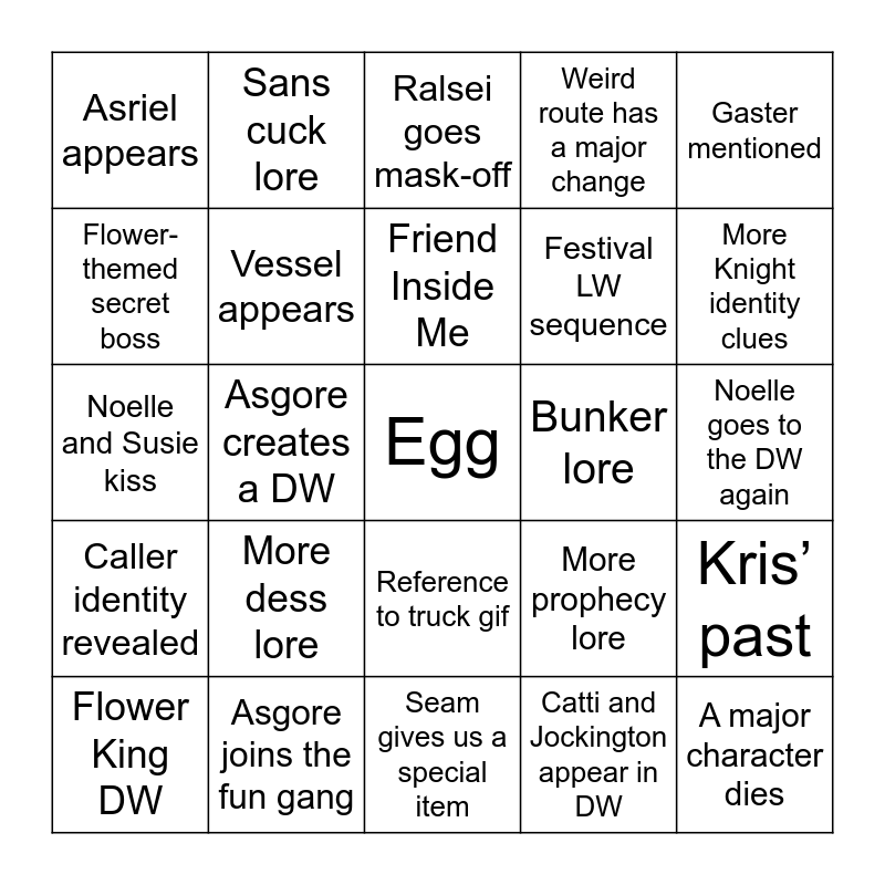 This bingo card has a free space and 24 words: More dess lore, Asgore joins the fun gang, Friend Inside Me, Flower King DW, Gaster mentioned, Asriel appears, Flower-themed secret boss, Sans cuck lore, Bunker lore, Reference to truck gif, Festival LW sequence, Noelle and Susie kiss, More prophecy lore, Kris’ past, Vessel appears, Catti and Jockington appear in DW, Noelle goes to the DW again, Ralsei goes mask-off, More Knight identity clues, Asgore creates a DW, A major character dies, Caller identity revealed, Weird route has a major change and Seam gives us a special item.