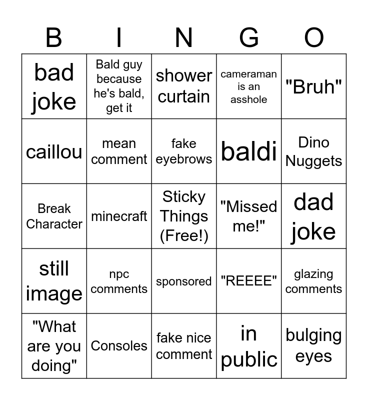 This bingo card has a free space and 34 words: takis, in public, Donald Duck, roleplay, still image, mean comment, "Bruh", "What are you doing", Bald guy because he's bald, get it, bloopers, fake eyebrows, shower curtain, laughing crying emoji, bald joke, "Missed me!", Dino Nuggets, Consoles, Break Character, npc comments, "REEEE", sponsored, Irrelevant Reference, bad joke, dad joke, fake nice comment, bulging eyes, cameraman is an asshole, cringe, baldi, caillou, mario, minecraft, glazing comments and actually funny comment.