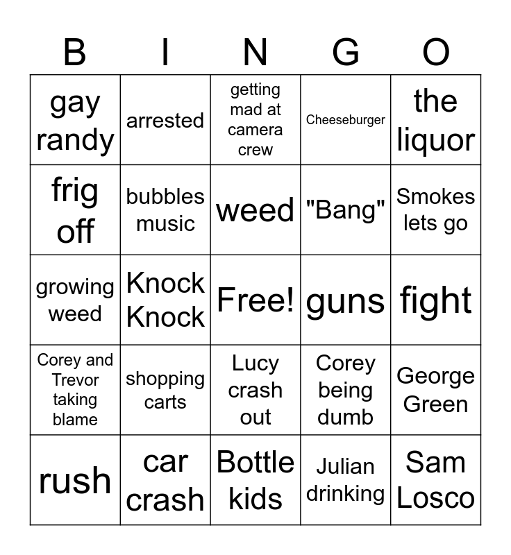 This bingo card has a free space and 24 words: shopping carts, car crash, weed, rush, the liquor, gay randy, frig off, arrested, guns, Lucy crash out, "Bang", growing weed, Corey being dumb, George Green, bubbles music, Julian drinking, fight, getting mad at camera crew, Smokes lets go, Knock Knock, Sam Losco, Corey and Trevor taking blame, Cheeseburger and Bottle kids.