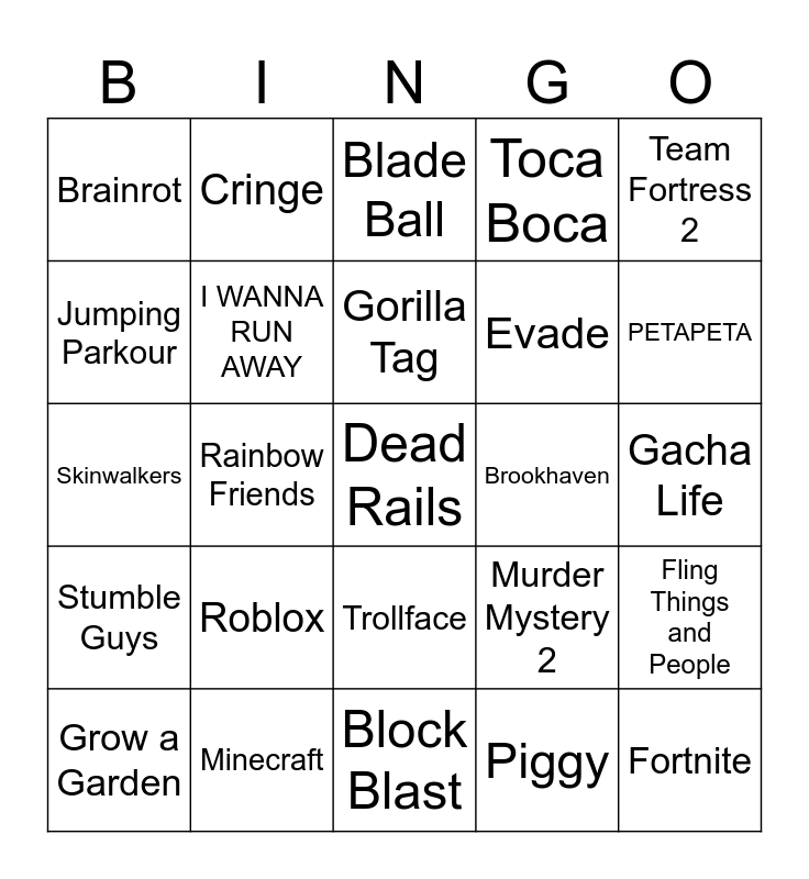This bingo card has a free space and 24 words: Roblox, Minecraft, Gorilla Tag, Grow a Garden, Team Fortress 2, Brainrot, Jumping Parkour, Cringe, Brookhaven, Trollface, Evade, Skinwalkers, Murder Mystery 2, Fling Things and People, I WANNA RUN AWAY, Piggy, Gacha Life, Blade Ball, PETAPETA, Rainbow Friends, Fortnite, Stumble Guys, Toca Boca and Block Blast.