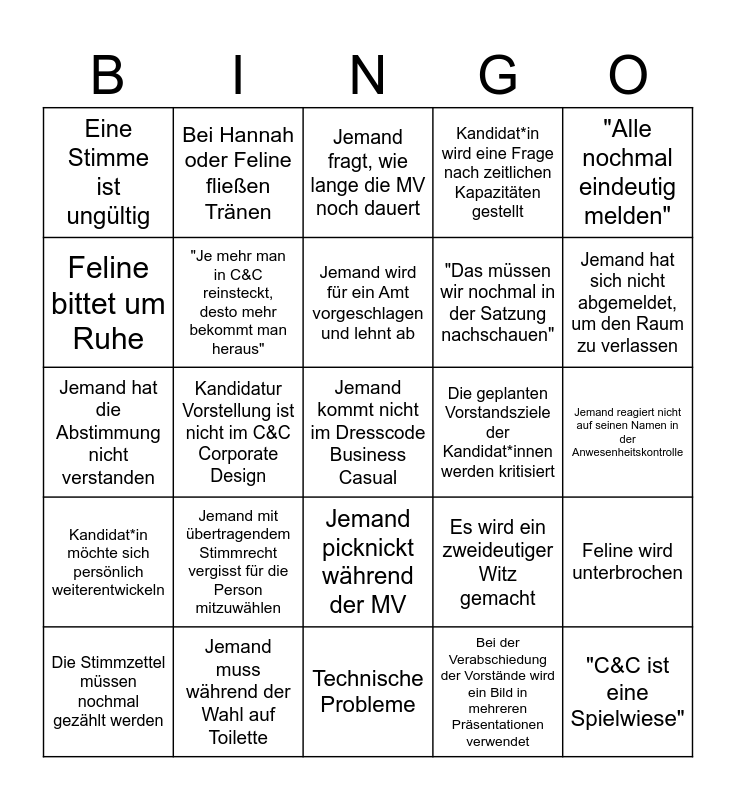 This bingo card has 25 words: Jemand mit übertragendem Stimmrecht vergisst für die Person mitzuwählen, Technische Probleme, Jemand wird für ein Amt vorgeschlagen und lehnt ab, Die Stimmzettel müssen nochmal gezählt werden, "Alle nochmal eindeutig melden", Eine Stimme ist ungültig, Feline bittet um Ruhe, Bei Hannah oder Feline fließen Tränen, Die geplanten Vorstandsziele der Kandidat*innen werden kritisiert, Jemand picknickt während der MV, "Das müssen wir nochmal in der Satzung nachschauen", Jemand hat die Abstimmung nicht verstanden, Es wird ein zweideutiger Witz gemacht, Feline wird unterbrochen, "Je mehr man in C&C reinsteckt, desto mehr bekommt man heraus", "C&C ist eine Spielwiese", Jemand reagiert nicht auf seinen Namen in der Anwesenheitskontrolle, Jemand fragt, wie lange die MV noch dauert, Jemand hat sich nicht abgemeldet, um den Raum zu verlassen, Kandidatur Vorstellung ist nicht im C&C Corporate Design, Jemand kommt nicht im Dresscode Business Casual, Jemand muss während der Wahl auf Toilette, Kandidat*in möchte sich persönlich weiterentwickeln, Kandidat*in wird eine Frage nach zeitlichen Kapazitäten gestellt and Bei der Verabschiedung der Vorstände wird ein Bild in mehreren Präsentationen verwendet.