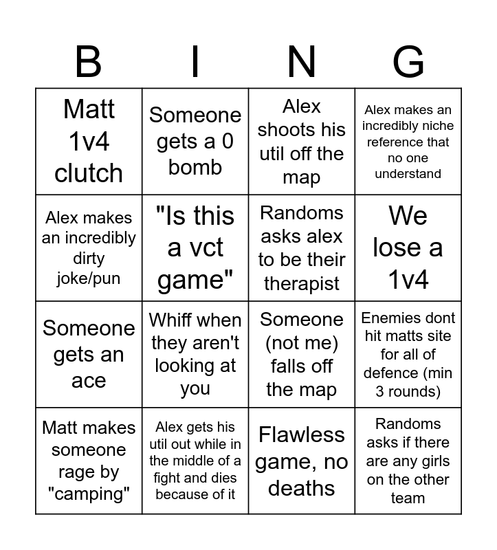 This bingo card has 16 words: Alex gets his util out while in the middle of a fight and dies because of it, Enemies dont hit matts site for all of defence (min 3 rounds), Alex shoots his util off the map, Matt 1v4 clutch, Someone gets an ace, Someone gets a 0 bomb, Someone (not me) falls off the map, Flawless game, no deaths, Alex makes an incredibly dirty joke/pun, "Is this a vct game", Matt makes someone rage by "camping", Alex makes an incredibly niche reference that no one understand, Whiff when they aren't looking at you, We lose a 1v4, Randoms asks alex to be their therapist and Randoms asks if there are any girls on the other team.