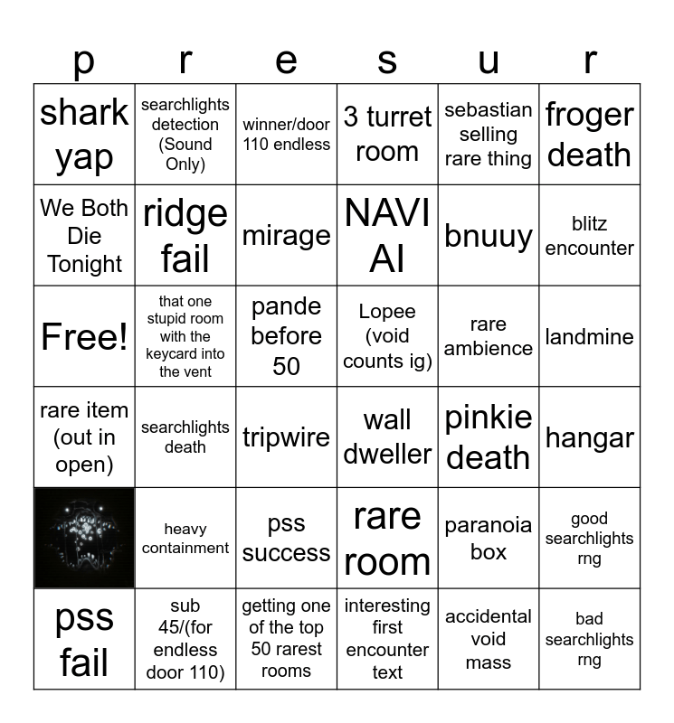 This bingo card has 1 images and 35 words: rare room, pss success, interesting first encounter text, We Both Die Tonight, rare item (out in open), Lopee (void counts ig), ridge fail, getting one of the top 50 rarest rooms, sebastian selling rare thing, paranoia box, blitz encounter, 3 turret room, good searchlights rng, that one stupid room with the keycard into the vent, NAVI AI, shark yap, rare ambience, Free!, winner/door 110 endless, pande before 50, searchlights death, wall dweller, tripwire, pinkie death, searchlights detection (Sound Only), bnuuy, sub 45/(for endless door 110), mirage, froger death, bad searchlights rng, pss fail, hangar, landmine, heavy containment and accidental void mass.
