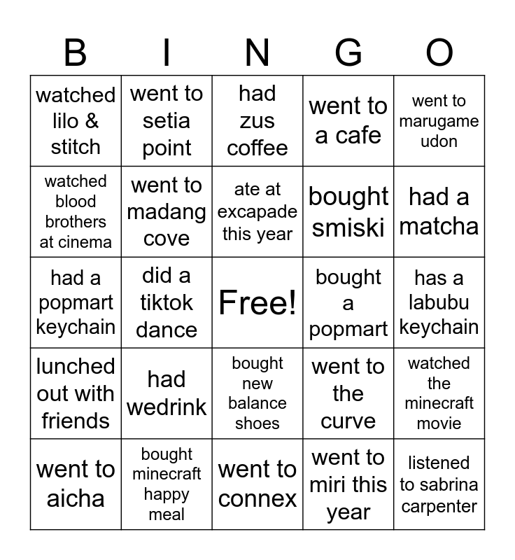 This bingo card has a free space and 24 words: went to aicha, had wedrink, ate at excapade this year, went to miri this year, went to marugame udon, watched lilo & stitch, went to setia point, had zus coffee, bought a popmart, has a labubu keychain, had a popmart keychain, went to madang cove, went to the curve, watched the minecraft movie, watched blood brothers at cinema, bought minecraft happy meal, went to connex, went to a cafe, had a matcha, lunched out with friends, did a tiktok dance, bought new balance shoes, bought smiski and listened to sabrina carpenter.