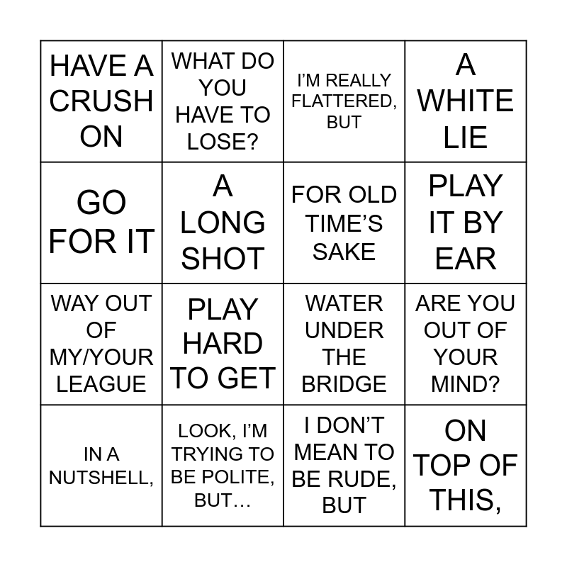 This bingo card has 19 words: WATER UNDER THE BRIDGE, WATER UNDER THE BRIDGE, I’M REALLY FLATTERED, BUT, ON TOP OF THIS,, ARE YOU OUT OF YOUR MIND?, GO FOR IT, I DON’T MEAN TO BE RUDE, BUT, HAVE A CRUSH ON, WHAT DO YOU HAVE TO LOSE?, WAY OUT OF MY/YOUR LEAGUE, PLAY HARD TO GET, A LONG SHOT, FOR OLD TIME’S SAKE, LOOK, I’M TRYING TO BE POLITE, BUT…, IN A NUTSHELL,, WON’T TAKE NO FOR AN ANSWER, A WHITE LIE, PLAY IT BY EAR and THAT’S THE KEY ISSUE HERE..