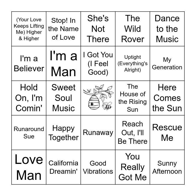 This bingo card has a free space and 29 words: Love Man, Gimme Some Lovin', Sweet Soul Music, Get Ready, (Your Love Keeps Lifting Me) Higher & Higher, She's Not There, I'm a Man, Happy Together, The House of the Rising Sun, California Dreamin', Here Comes the Sun, Sunny Afternoon, Good Vibrations, You Really Got Me, My Generation, All Day and All of the Night, Runaway, Runaround Sue, Dance to the Music, Hold On, I'm Comin', Reach Out, I'll Be There, Soul Man, Uptight (Everything's Alright), I'm a Believer, The Wild Rover, Stop! In the Name of Love, Rescue Me, I Got You (I Feel Good) and Louie Louie.