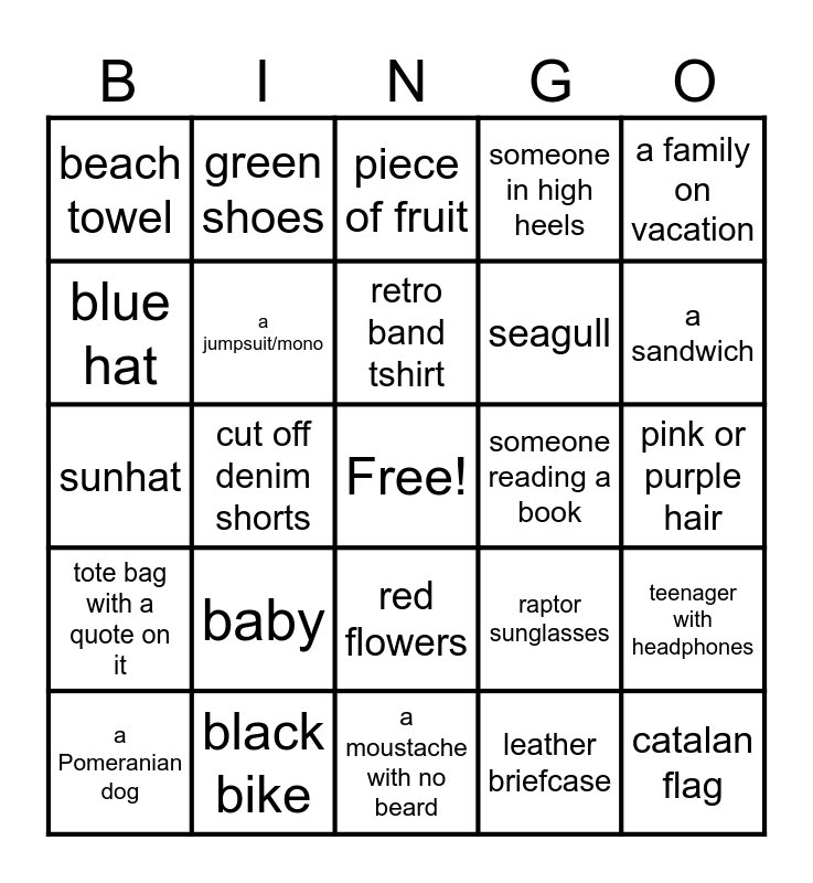 This bingo card has a free space and 24 words: baby, black bike, retro band tshirt, a Pomeranian dog, a family on vacation, beach towel, blue hat, green shoes, someone reading a book, red flowers, seagull, sunhat, raptor sunglasses, teenager with headphones, a jumpsuit/mono, leather briefcase, pink or purple hair, piece of fruit, a sandwich, cut off denim shorts, catalan flag, tote bag with a quote on it, someone in high heels and a moustache with no beard.