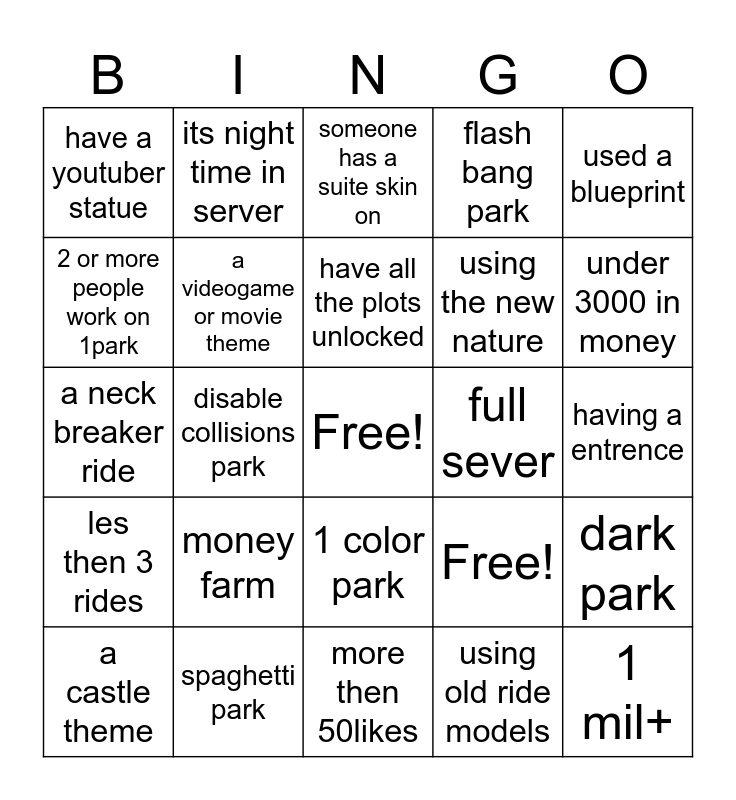 This bingo card has a free space and 25 words: money farm, more then 50likes, have all the plots unlocked, a castle theme, used a blueprint, have a youtuber statue, 2 or more people work on 1park, its night time in server, full sever, 1 color park, using the new nature, a neck breaker ride, Free!, dark park, a videogame or movie theme, have more then 120 guests, having a entrence, someone has a suite skin on, under 3000 in money, disable collisions park, 1 mil+, spaghetti park, les then 3 rides, flash bang park and using old ride models.