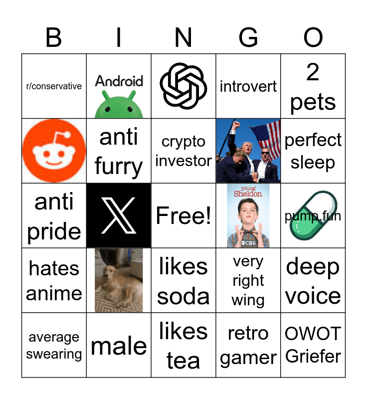This bingo card has 8 images, a free space and 17 words: male, crypto investor, average swearing, 2 pets, r/conservative, likes soda, anti pride, very right wing, deep voice, anti furry, retro gamer, pump.fun, perfect sleep, OWOT Griefer, hates anime, introvert and likes tea.