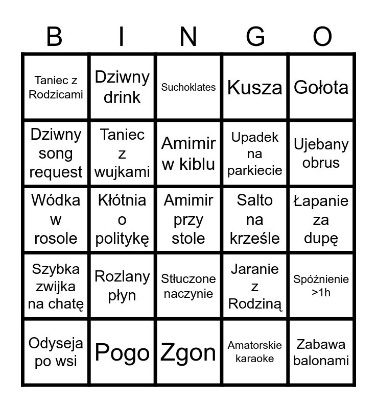 This bingo card has 25 words: Szybka zwijka na chatę, Pogo, Amimir przy stole, Amatorskie karaoke, Gołota, Taniec z Rodzicami, Dziwny drink, Suchoklates, Salto na krześle, Spóźnienie >1h, Dziwny song request, Taniec z wujkami, Zgon, Jaranie z Rodziną, Ujebany obrus, Odyseja po wsi, Kłótnia o politykę, Amimir w kiblu, Upadek na parkiecie, Łapanie za dupę, Wódka w rosole, Rozlany płyn, Stłuczone naczynie, Kusza and Zabawa balonami.