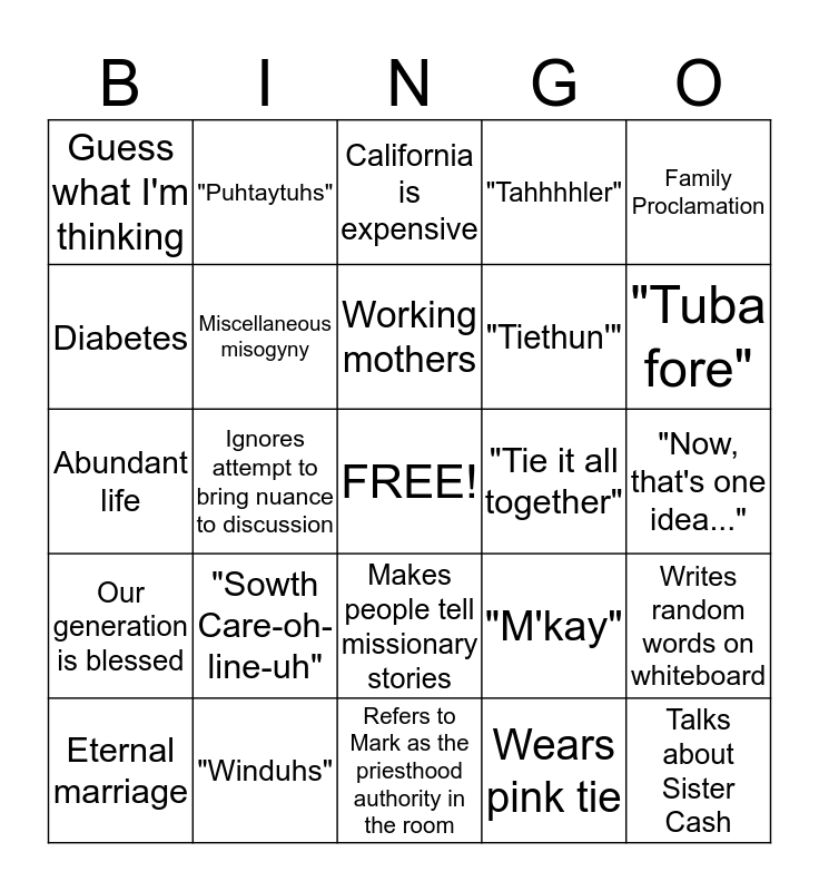 This bingo card has a free space and 24 words: "Sowth Care-oh-line-uh", "Winduhs", Working mothers, Eternal marriage, Family Proclamation, Guess what I'm thinking, Diabetes, "Puhtaytuhs", "Tie it all together", Makes people tell missionary stories, "Tiethun'", Abundant life, "M'kay", Writes random words on whiteboard, Miscellaneous misogyny, Wears pink tie, "Now, that's one idea...", California is expensive, "Tuba fore", Ignores attempt to bring nuance to discussion, Talks about Sister Cash, Our generation is blessed, "Tahhhhler" and Refers to Mark as the priesthood authority in the room.