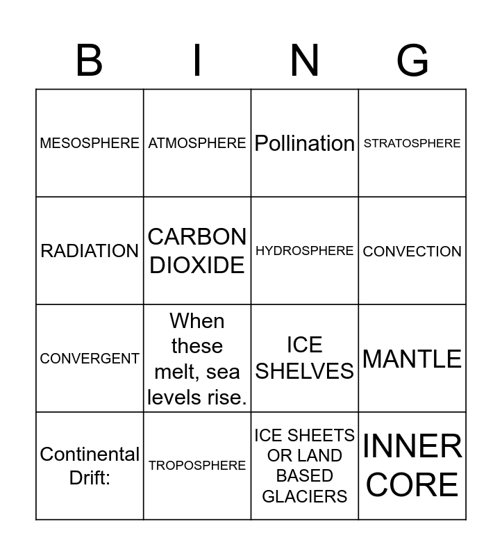 This bingo card has a free space and 15 words: Continental Drift:, INNER CORE, Pollination, MESOSPHERE, CONVECTION, RADIATION, When these melt, sea levels rise., ICE SHEETS OR LAND BASED GLACIERS, CARBON DIOXIDE, CONVERGENT, MANTLE, STRATOSPHERE, HYDROSPHERE, ATMOSPHERE and TROPOSPHERE.